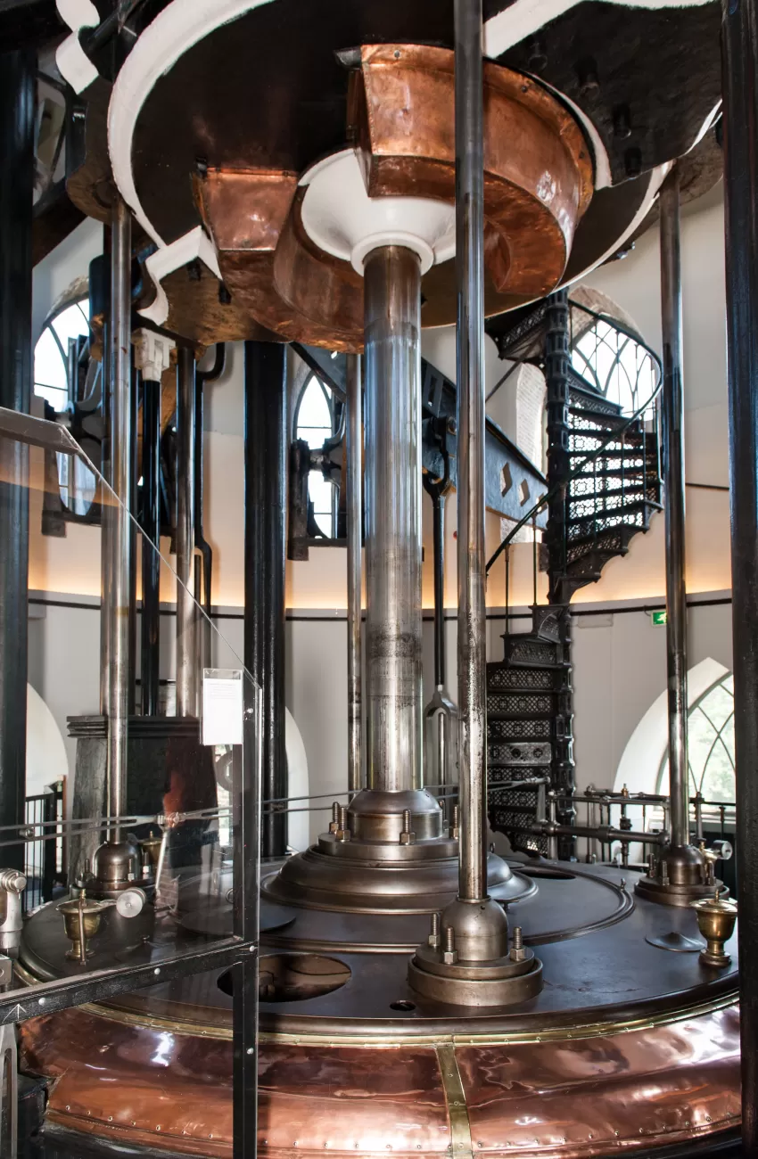 De trots van het museum is de wereldberoemde stoommachine uit 1849, die in zijn volle glorie kan worden bekeken in de machinekamer. De grootste cilinder ter wereld, met een diameter van 3,66 meter, bevindt zich onder de werkvloer. De acht pompen bevinden zich aan het einde van de balansarmen. Elke pomp bestaat uit een buis, een zuiger en vlinderkleppen. De zuiger wordt bewogen met kettingen in de zuigerbuis. Elke pomp kan 8.000 liter water per slag bijna 5 meter omhoog pompen. Er worden vijf slagen per minuut gemaakt.